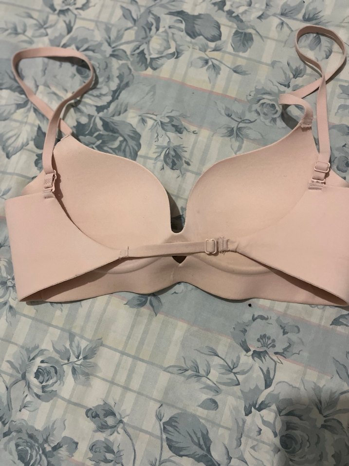 Pastel bej renkte, minimalist düz kumaştan yapılmış sütyen. Ayarlanabilir askıları ve ön kapaması bulunur.