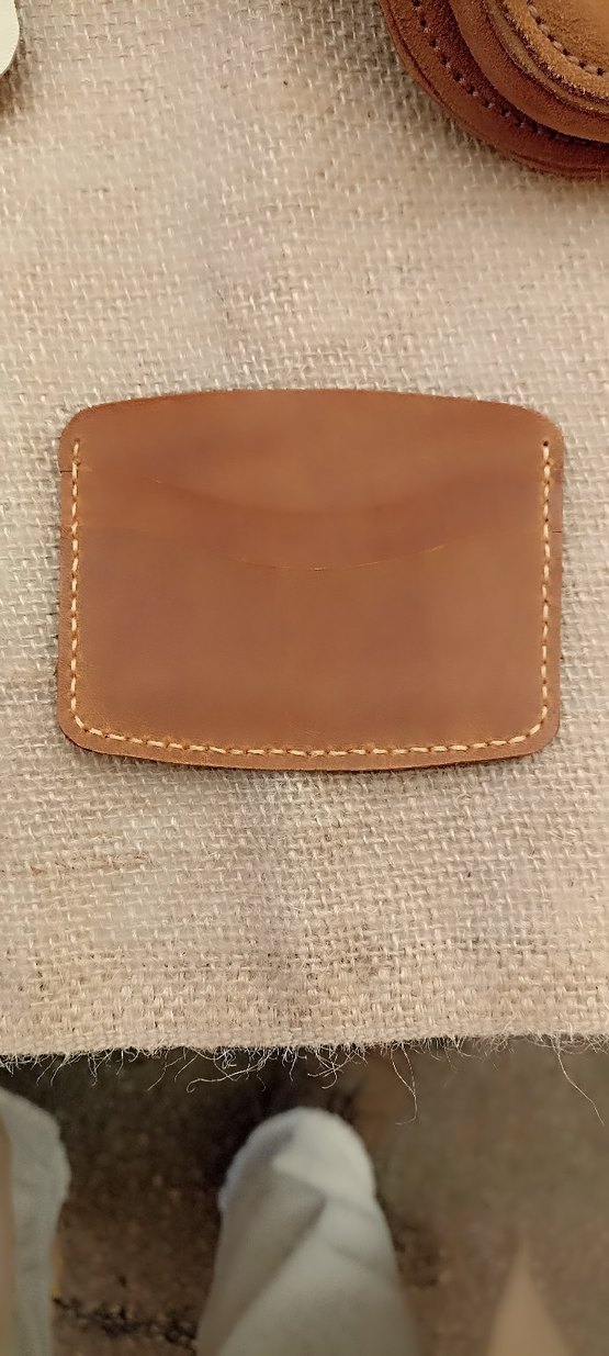 Açık bej renkte, desen içermeyen ve dikişli kenarları olan minimalist ve karşı kültür tarzında erkek cüzdanı. Elde üretilmiştir