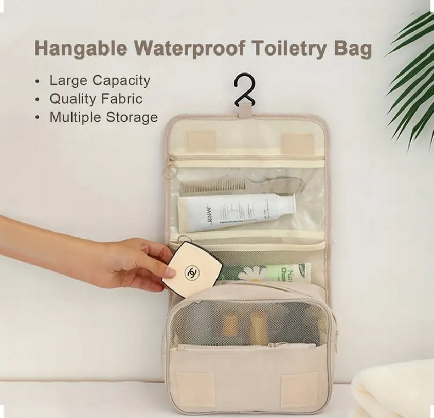 Bej renkte, sentetik kumaştan yapılmış fermuarlı makyaj çantasıdır. Çoklu bölmeleri ve su geçirmez iç yüzeyi ile düzenli depolama sağlar. Asma halkası mevcuttur.