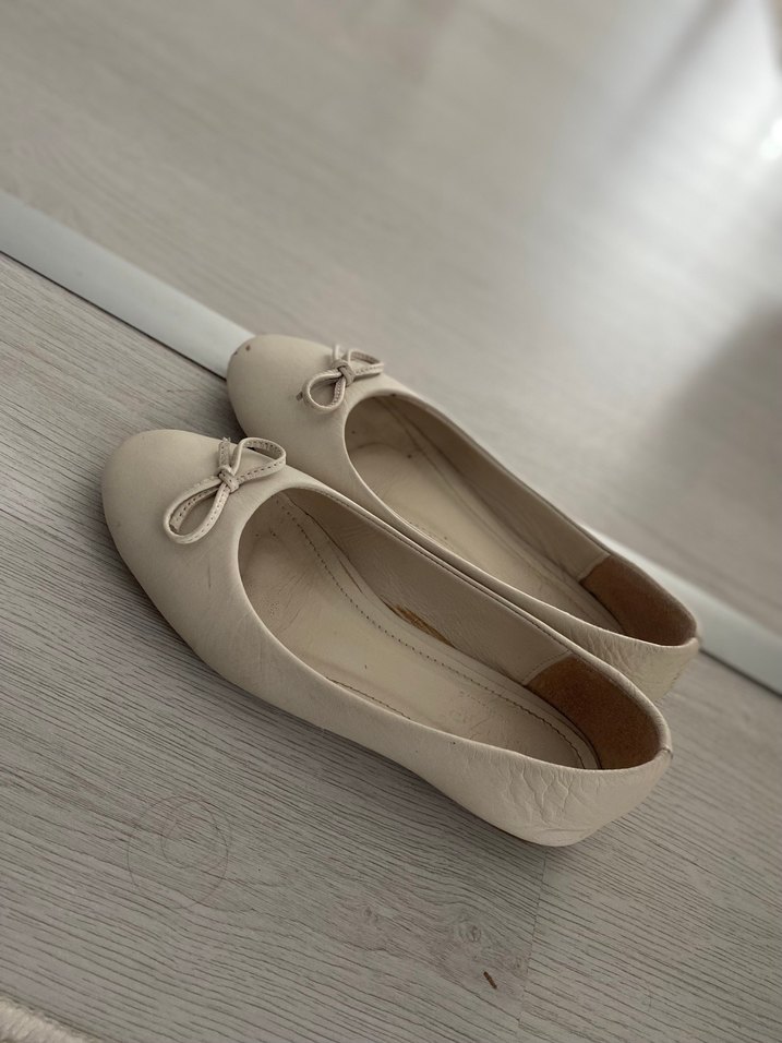 Bej renkte, küçük fiyonk detaylı kadın babet. Deri malzemeden üretilmiş, günlük kullanım için modern klasik tarzda. Önündeki lekesi yüzünden uygun fiyata veriyorum yoksa çok rahat şık bir babet sayılı giydim