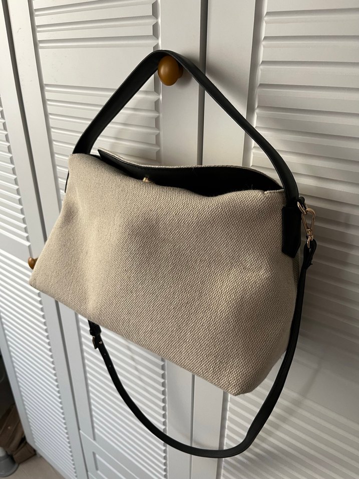 Bej renkte, sentetik kumaştan yapılmış, tokalı ve siyah askılı minimalist kadın çantası, günlük kullanıma uygun.