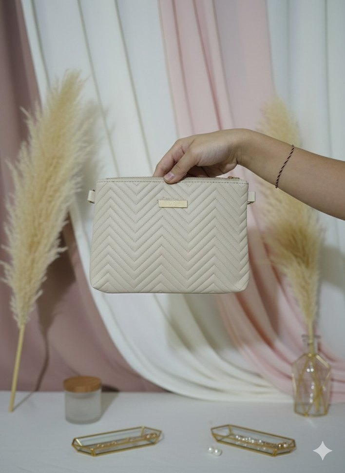 Bej renkte, fermuarlı, minimalist tasarımlı kadın çantası. Sentetik kumaştan yapılmış, modern klasik ve günlük kullanıma uygun tarzda, pastel tonlarda ve desensiz.