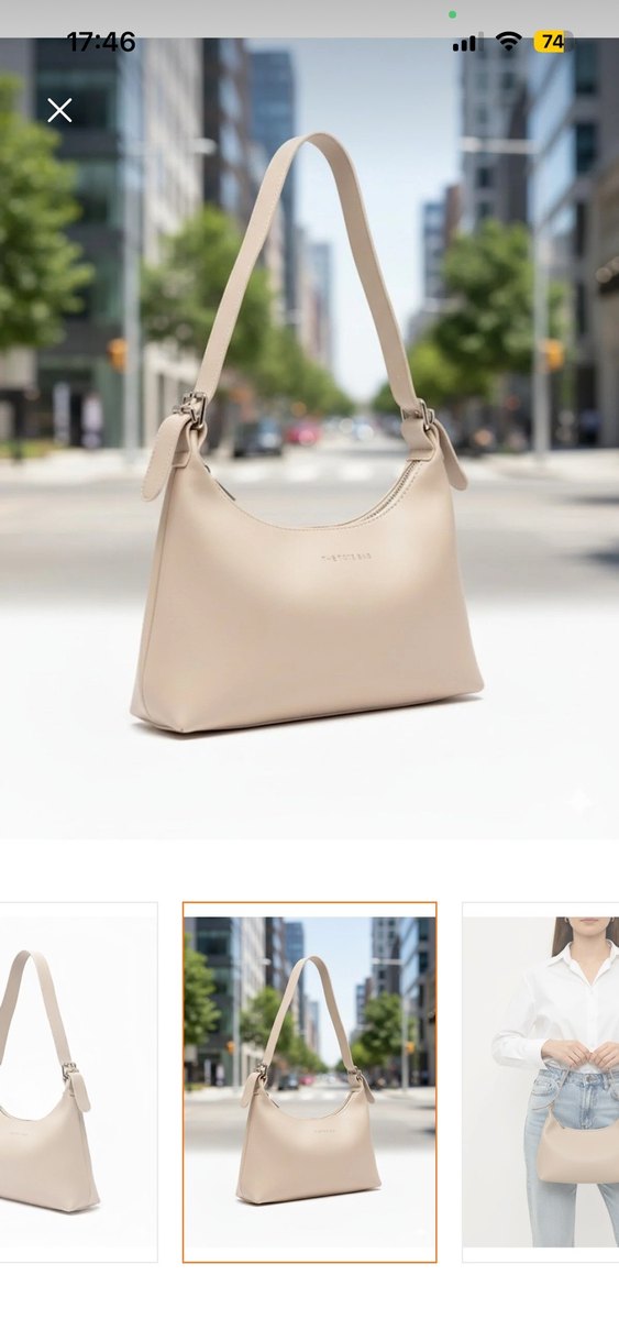 Bej renkte, tokalı askıya sahip minimalist tasarımlı deri çanta. Günlük kullanıma uygun, desen içermeyen çağdaş bir model.