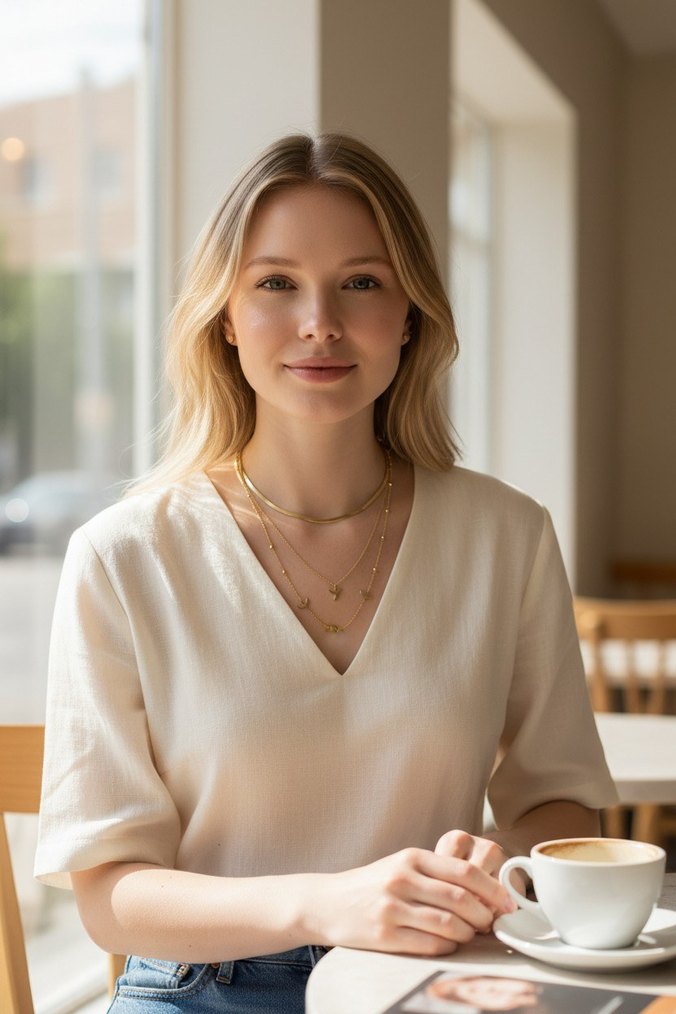 Bej renkte, kısa ve minimalist tasarıma sahip kadın kolye. Günlük kullanıma uygun, desensiz ve rahat şıklık sunar. Trendy casual tarzıyla uyumludur. ✨