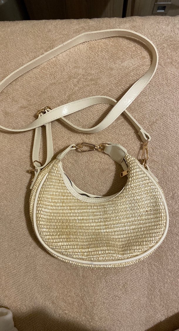 Bej renkli, minimal bohem tarzda, kemerli ve hafif sentetik kumaştan yapılmış kadın omuz çantası. Günlük kullanım için uygun, desensiz ve ayarlanabilir askılı çanta.
