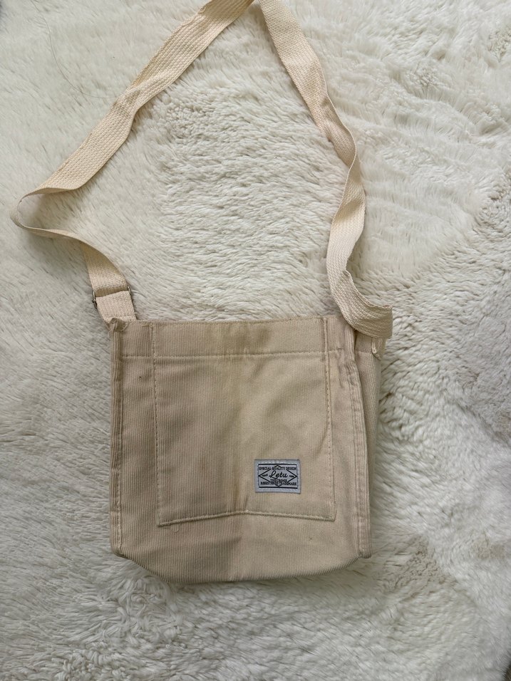 Bej renkli, yumuşak ve sıcak kumaştan yapılmış kadın omuz çantası. Ayarlanabilir askısı ve küçük ön cepli sade tasarımıyla günlük kullanıma uygun.