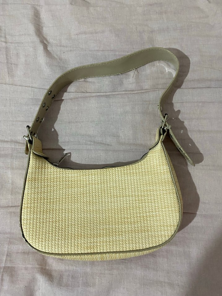 Bej renkli, tokalı askıya sahip minimalist kadın omuz çantası. Sentetik kumaştan üretilmiş, gündelik kullanıma uygun bohem tarzda.