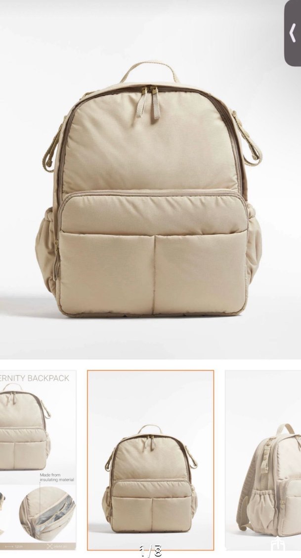 Bej renkli, minimalist tasarımlı kadın sırt çantası. Yumuşak sentetik kumaştan yapılmış, ön cepler dahil çoklu bölmeler içerir. 'RNITYBACKPACK' etiketi vardır, günlük kullanıma uygundur.