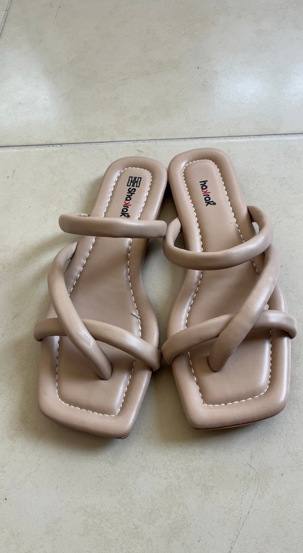 Bej renkli, tokalı bantlı topuklu kadın terlik. Minimalist ve bohem tarzda, yumuşak kauçuk malzemeden, günlük kullanım için uygundur.
