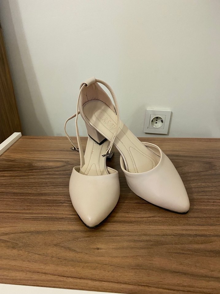 Bej renkli, blok topuklu kadın ayakkabısı. Kauçuk malzemeden üretilmiş, minimalist ve desensiz tasarıma sahip, ofis ve günlük şıklık için uygundur. Açık bej rengi bir kere giyildi temiz deformesi yoktur.