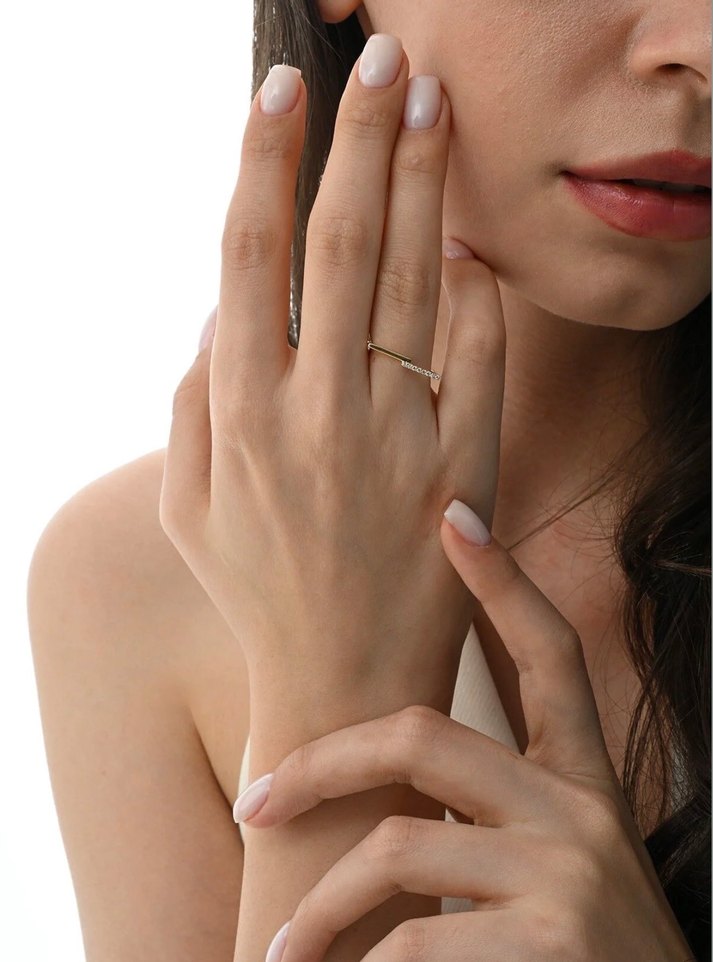 Hafif bej renkte, minimalist ve desen içermeyen kadın yüzüğü. Güncel ve sade tasarımıyla düğünlerde zarif bir şıklık sunar.