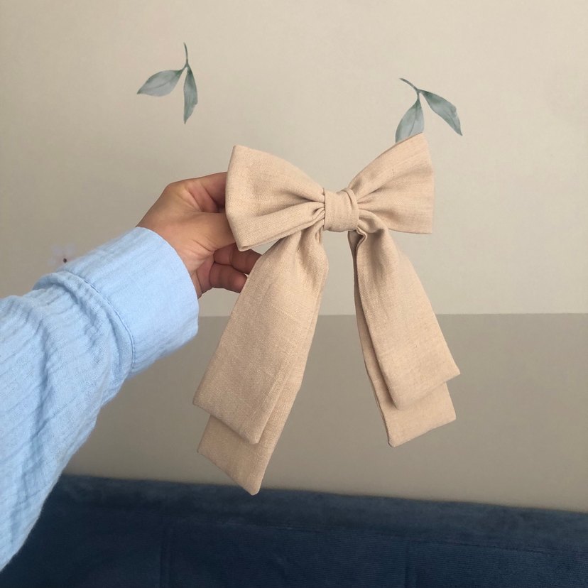 Bej renkte, minimalist ve bohem tarzda keten kumaştan yapılmış şık saç fiyonk tokası.