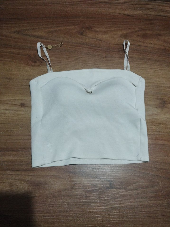beyaz renkte, desensiz, ayarlanabilir askılı midi uzunlukta minimalist tarzda streetwear büstiyer. Rahat ve sade tasarım. likralı büstiyer askısız ölçtüm boy 27 esnetmeden ölçüleri alındı iki koltuk arası 35 m l beden hiç kullanılmamıştır ama kumaş kenarında defolu soyulma gibi başka sorunu yok üstüne işleme ve ya aplike yapılarak kullanılır