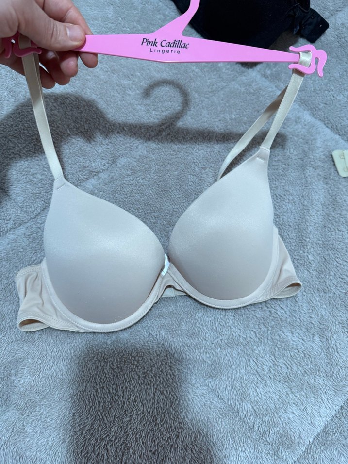 Bej renkte, desen içermeyen minimalist normcore tarzda sütyen. Normal uzunlukta askıları ve pastel tonlarıyla sade bir tasarıma sahiptir. Pink Cadillac markası.70c beden