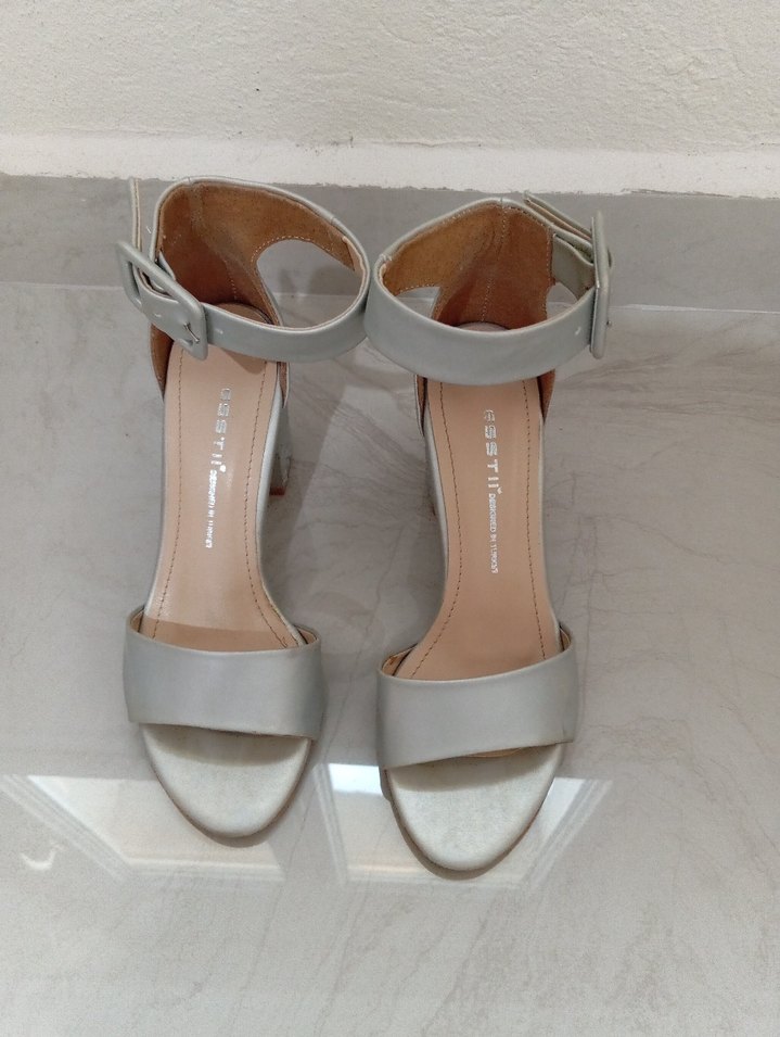 Bej platform topuklu, tokalı bilek kayışı ve kauçuk tabanlı minimalist kadın sandalet.