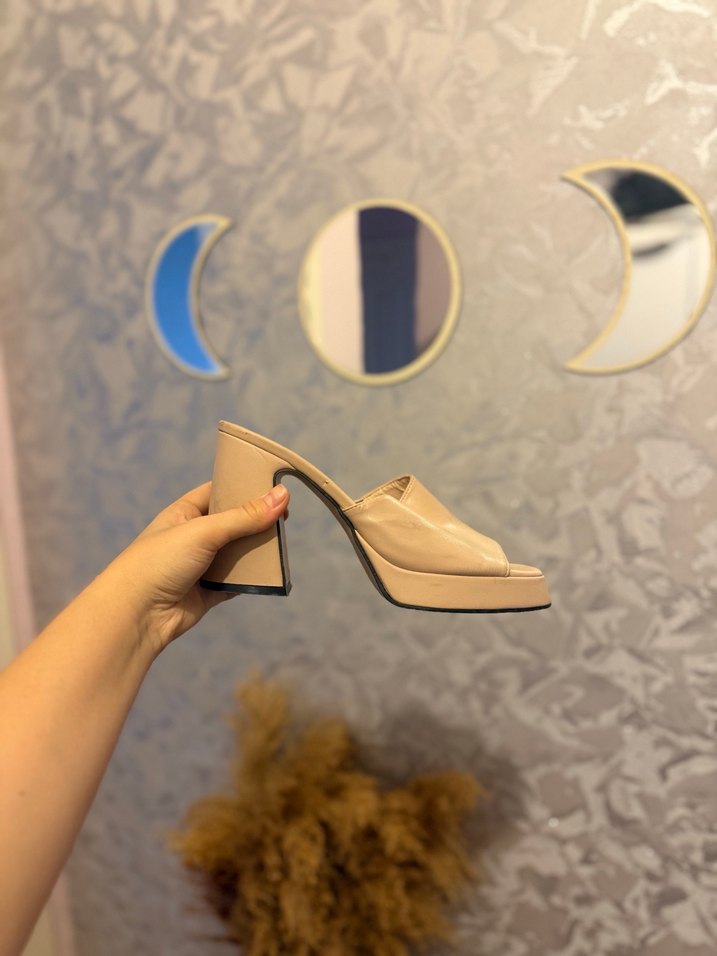 Bej renkte, minimal tasarımlı platform topuklu terlikler, günlük kullanım için rahat ve şık bir seçenektir. Modern tarzıyla trendsetterlara hitap eder.