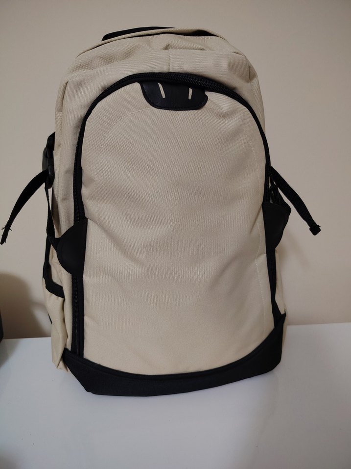 Bej renkte, fermuarlı ve dayanıklı sentetik kumaştan üretilmiş sırt çantası. Minimalist ve düz tasarımıyla günlük sokak stiline uygundur.