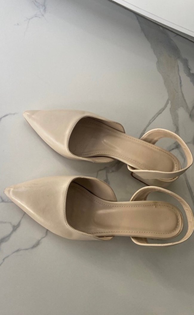 Bej renkli, minimalist ve stiletto topuklu, kauçuk malzemeden yapılmış, çağdaş tarza sahip kadın ayakkabısı. Günlük kullanıma uygun, zahmetsiz şıklık sunar. Ucunda küçük bi defosu var.