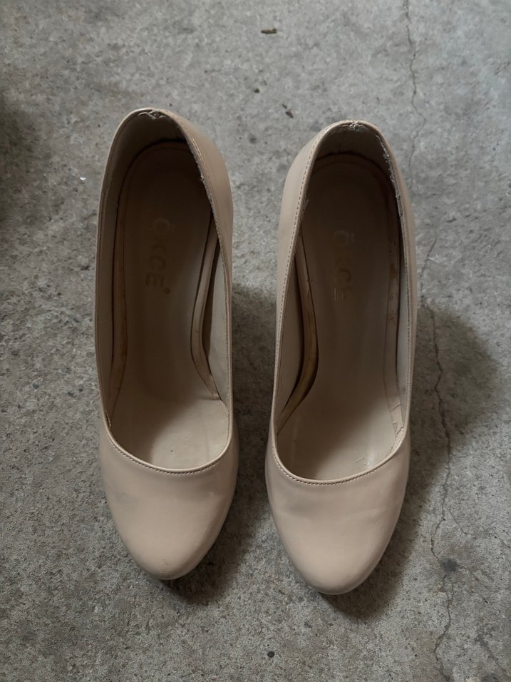Bej renk, kauçuk malzemeden yapılmış minimalist stiletto topuklu ayakkabı. Düz ve desensiz tasarımıyla ofis için klasik ve zahmetsiz şıklık sunar.