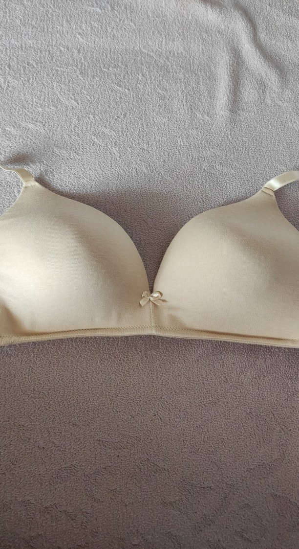 Bej, desen içermeyen minimalist sütyen. Ayarlanabilir askıları ve ortasında küçük fiyonk detayı bulunur. Günlük kullanım için rahat. hiç kullanılmadı sorunsuz yeni gibi