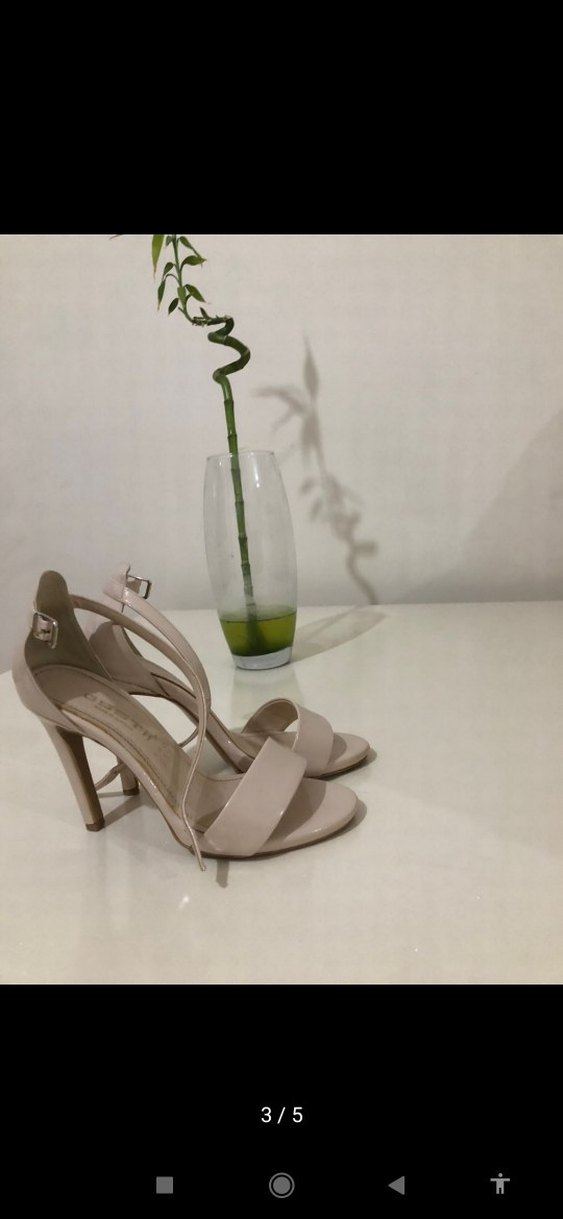 Bej renkte, ince topuklu, minimal tasarımlı, bağcıklı ve hafif yılan derisi desenli kadın abiye ayakkabı. Kauçuk malzemeden üretilmiştir, düğün için uygundur.