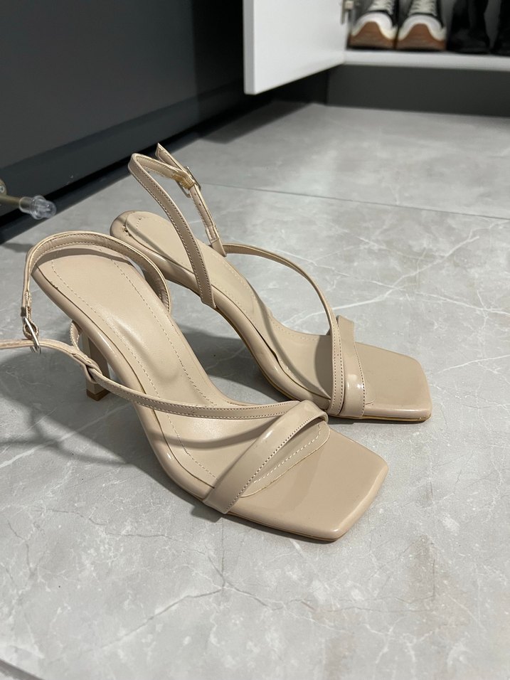 Bej renkli, stiletto topuklu ve minimalist tasarımlı kadın sandaletleri. Kauçuk malzemeden üretilmiş, günlük kullanıma uygun şık ve çağdaş tarzda.hiç kullanılmadı