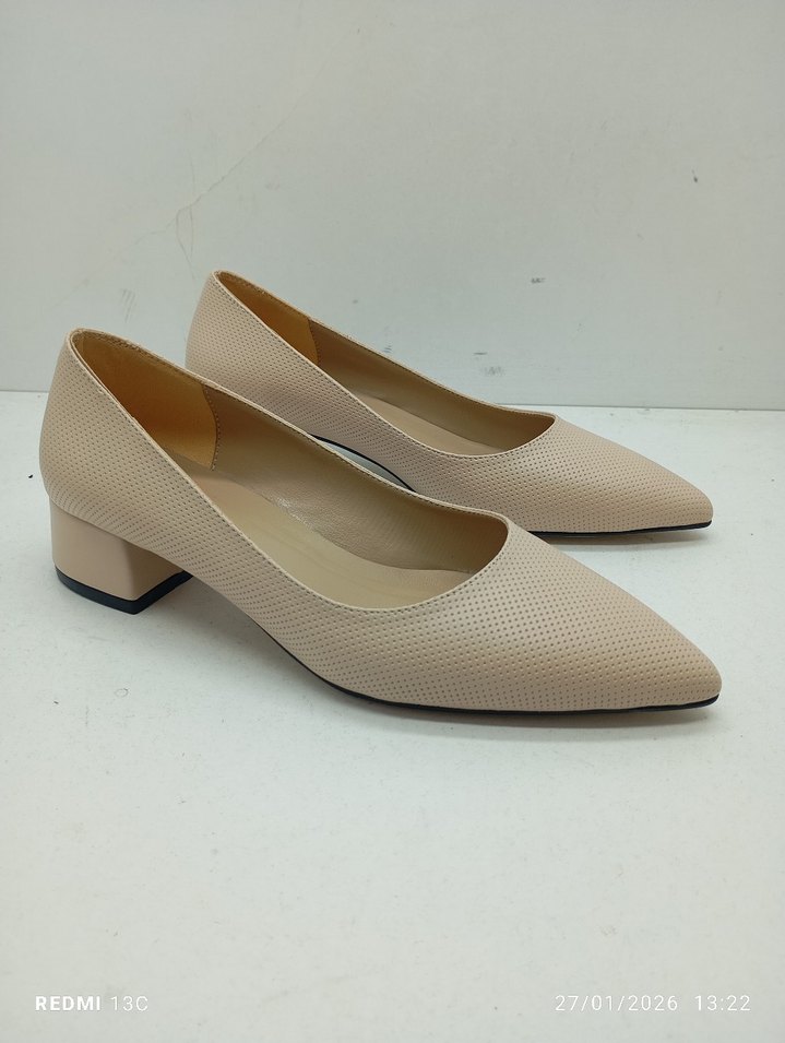 Topuk boyu 3 cm Bej renkte, blok topuklu kadın stiletto. Lastik malzemeden, pastel tonlarda ve yılan derisi desenli, ofis için şık ve çağdaş tasarım.