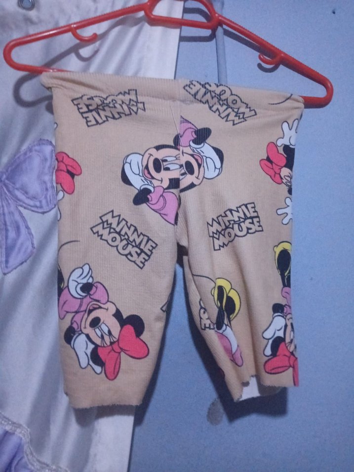 Yumuşak sentetik kumaştan yapılmış, bej renkte Minnie Mouse baskılı çocuk kısa tayt