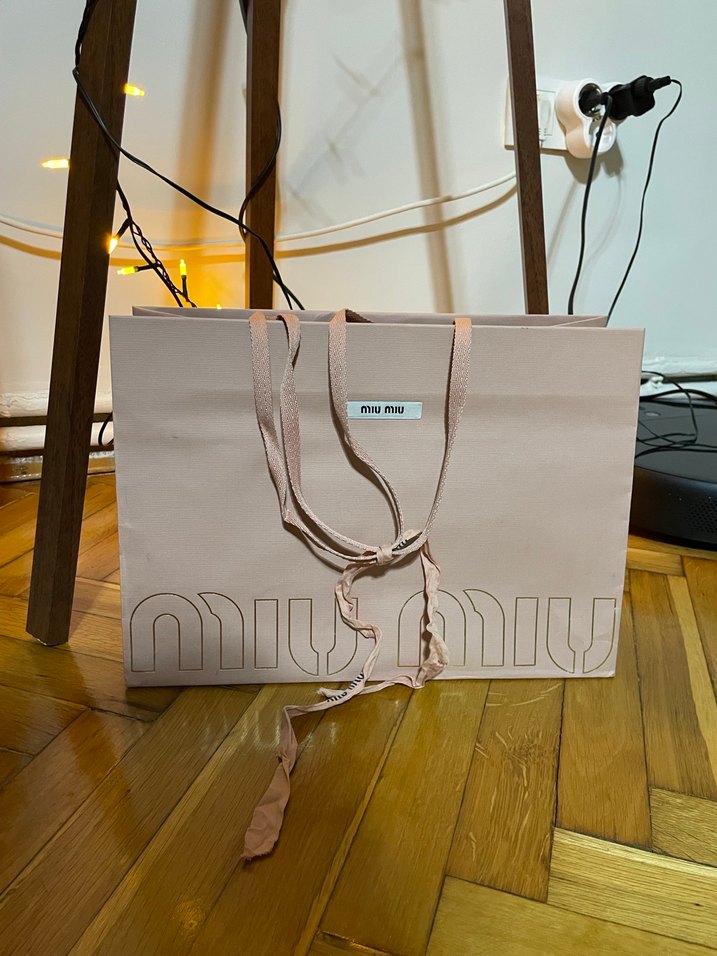 Miu Miu'nun pastel bej kadın kağıt çantası, baskılı logo ve kurdele detayıyla minimalist, çağdaş tarz sunar.