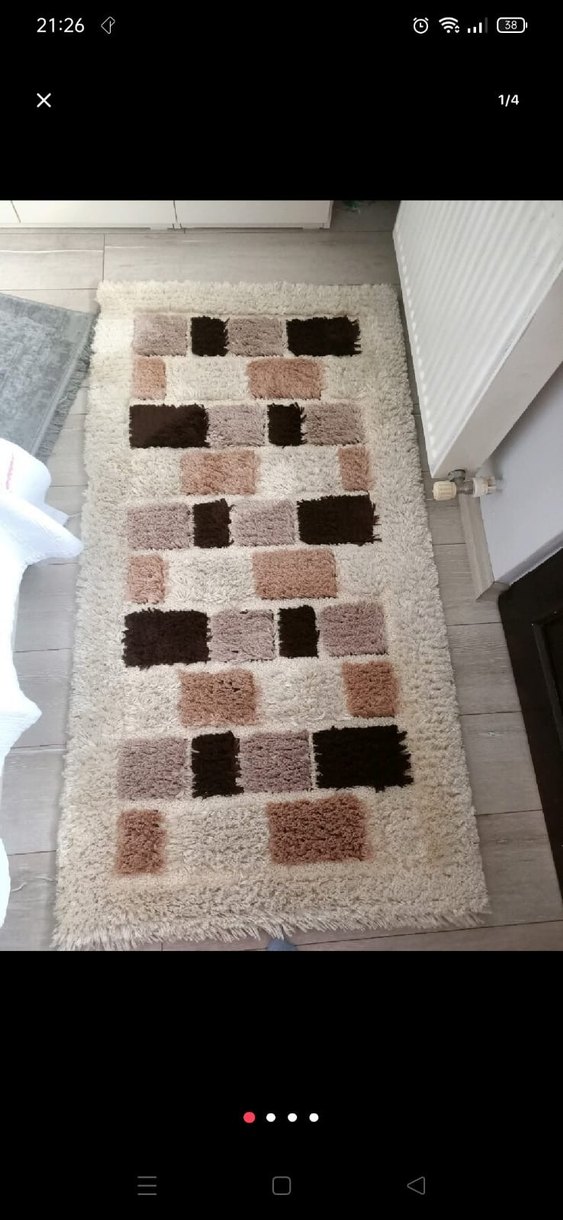 Bu bej halı, yumuşak dokusu ve açık-koyu dikdörtgen bloklardan oluşan modern deseniyle çağdaş iç mekanlara uygundur.