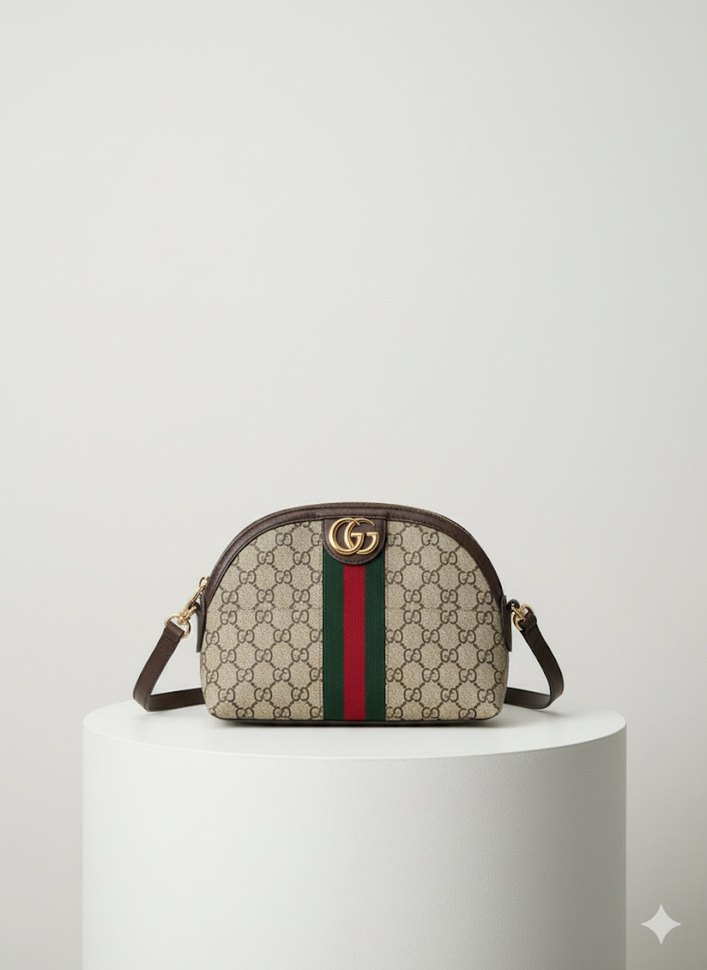 Bej renginde yandan takmalı Gucci desenli temiz kullanım az kullanılmış