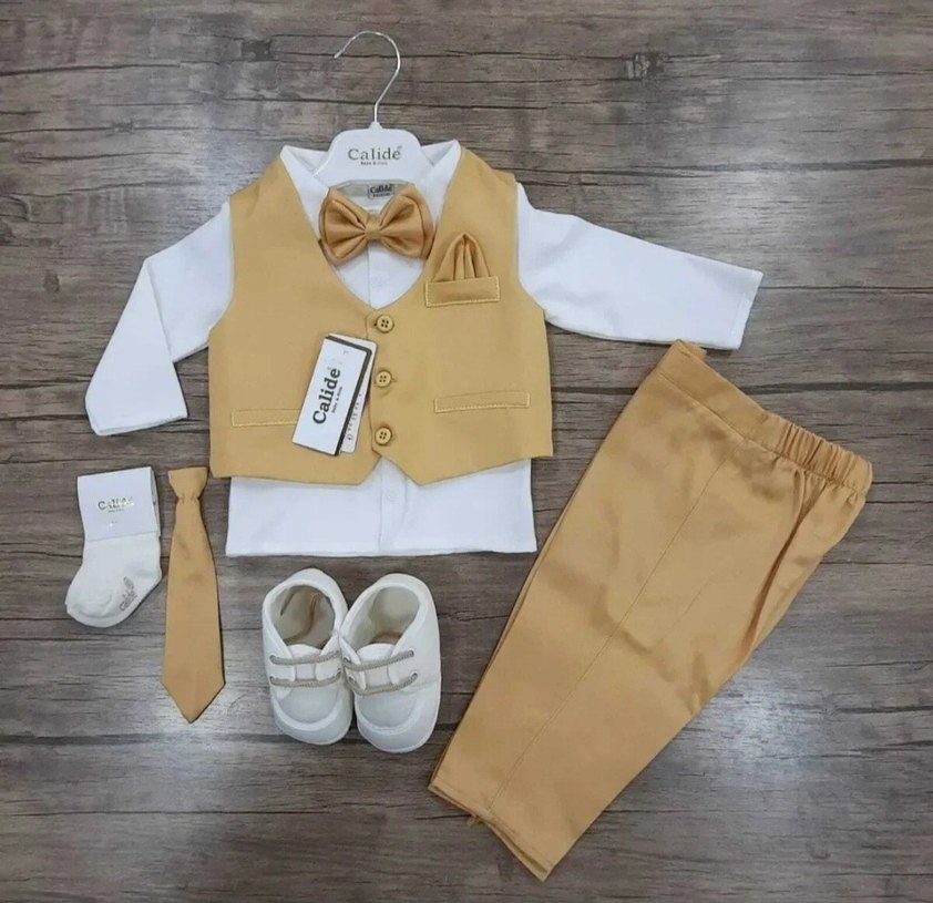 Bej renkte, düğmeli yelek ve pantolon, beyaz uzun kollu gömlek, papyon ve beyaz ayakkabılardan oluşan pamuklu bebek takımı. bütün parçaları eksiksiz olarak gönderilecek 1 defa 2 saat düğün de giydi oğlum hiç bir deformesi yok