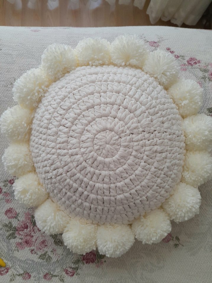 Yuvarlak bej dekoratif yastık, modern klasik tarzda oturma alanlarına şıklık katar. ️