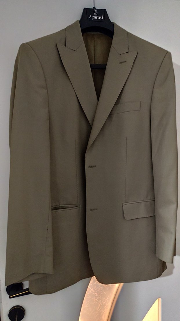 Bej renkli, düğmeli ve normal boyda erkek takım elbisesi. Modern klasik tarzda, kesimi regular fit ve uzun kolludur. ️