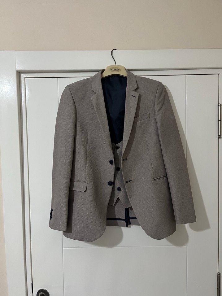 Bej renkli, kırmalı yaka ve düğmeli ön kısmı olan erkek takım elbisesi. Normal kesim, uzun kollu ve ofis için modern klasik tarzda. Ceket boy 68 eni düğmeleri kapalı 48 yelek boy 56 en 46 cm
