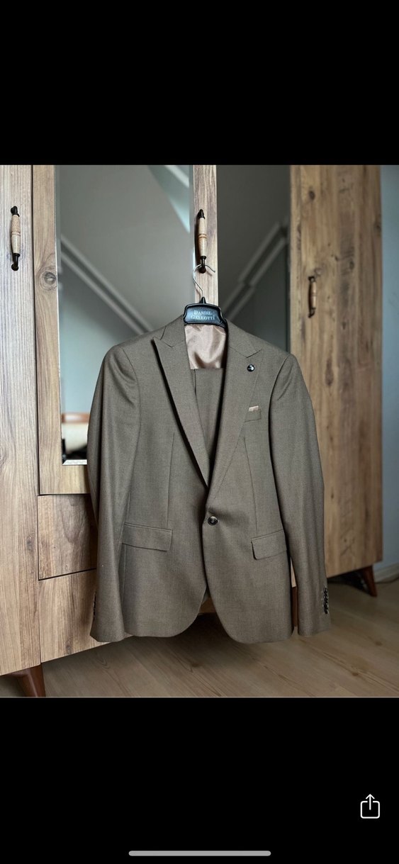 Bej renkte, modern klasik tarzda erkek takımı. Düğmeli, normal boy ve regular kesimle ofis kullanımına uygun uzun kollu ceket.Defosu yoktur.