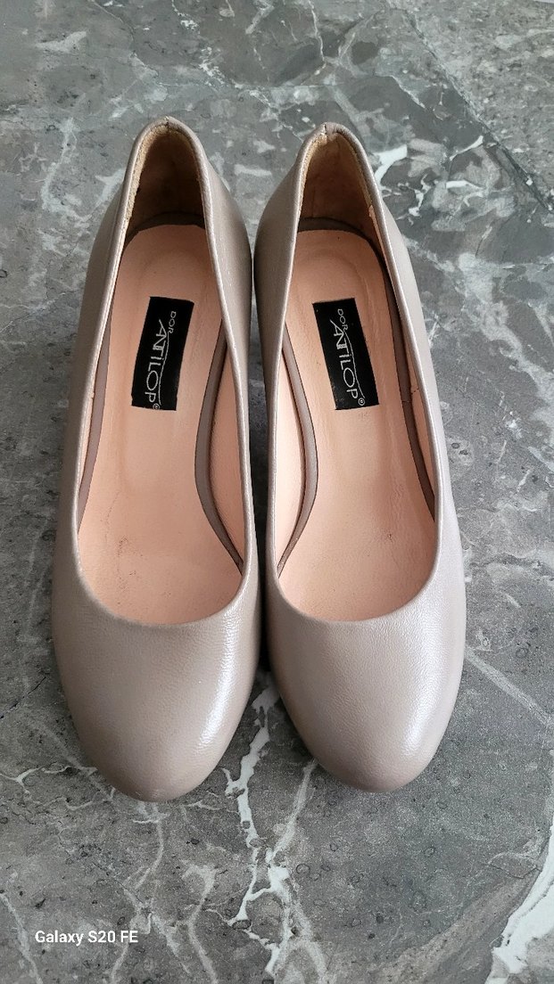 Bej renkte, kauçuk malzemeden yapılmış topuklu kadın ayakkabısı. Düz desensiz, modern klasik tarzı ve ofis için uygun, zahmetsiz şıklık sunar. Bir iki defa kullanıldı, tabanından anlaşılır. marka temsili. Antilop marka.