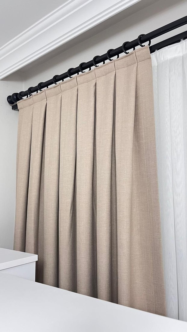 Bej renkte, modern klasik tarzda, desensiz ve yumuşak gri tonlarda perde. Mekâna sade ve şık bir görünüm kazandırır. sık pile iki kanat fiyatıdır