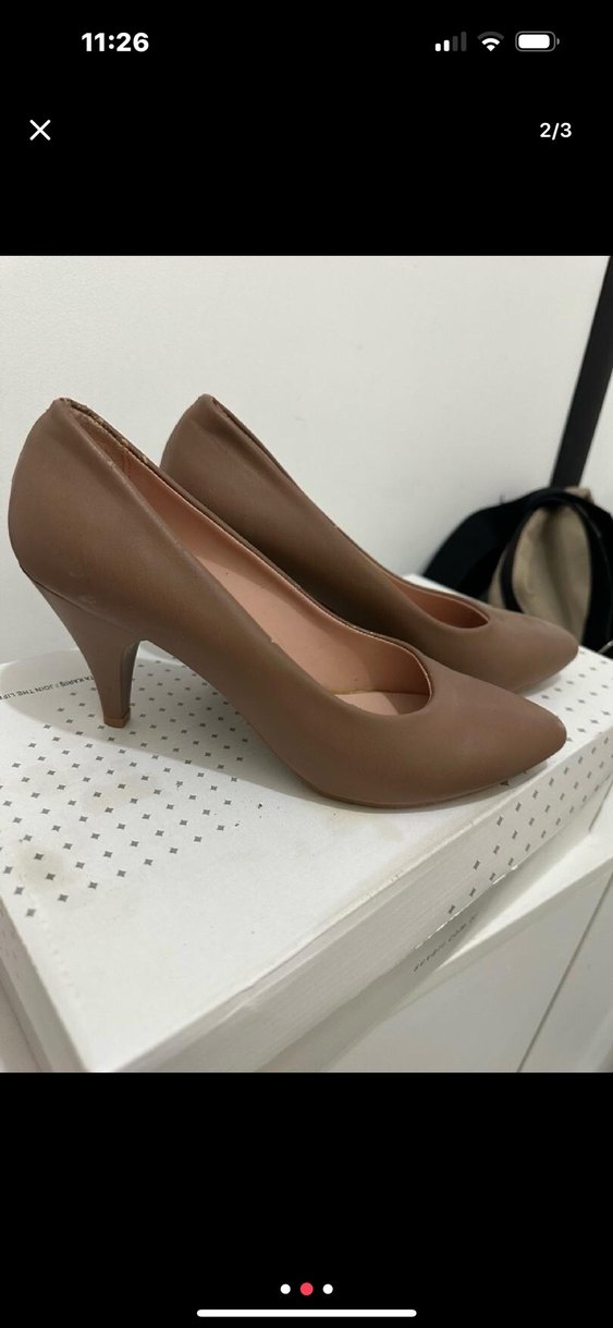 Bej renkte, modern klasik stilde, şık ve zarif ofis kullanımı için yumuşak malzemeden yapılmış stiletto topuklu ayakkabı.