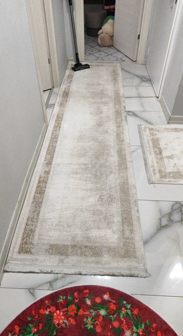 Modern klasik tarzda, bej ve gri tonlarında, desensiz yolluk halı.Az kullanıldı 300x80 ölçüsü