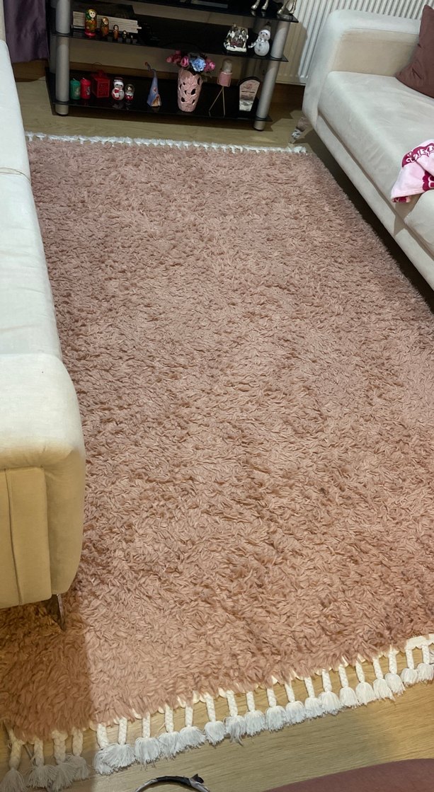 Yumuşak, peluş dokulu, bej renkli modern düz halı. Pastel tonu ile odanıza hafif bir sıcaklık katar.