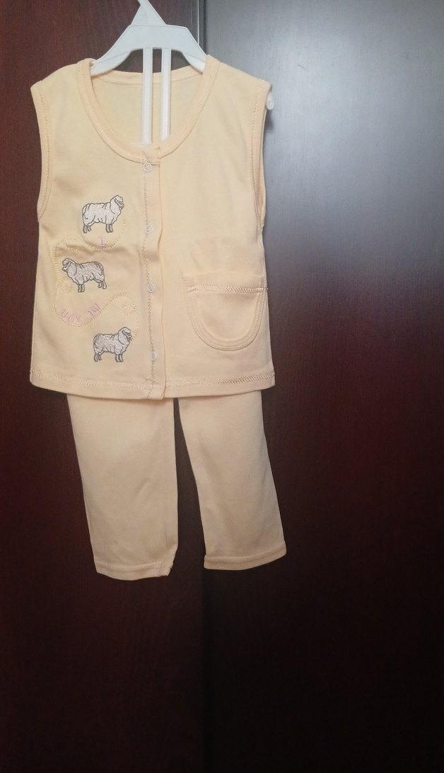 Düğmeli ön yüzü ve nakışlı koyun desenleri bulunan, yumuşak ve sıcak kumaştan yapılmış yelek bej bebek kız/erkek takımı.
