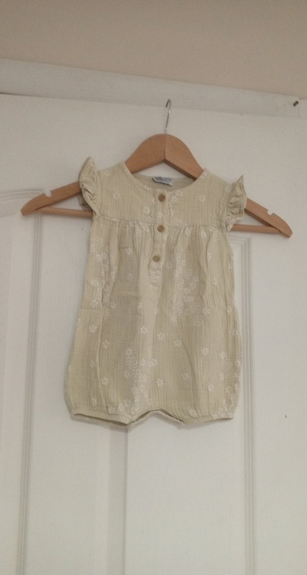 Bej renkte, düğmeli ve pastel tonlarda nakışlı yumuşak kumaştan yapılmış bebek kız tulumu.