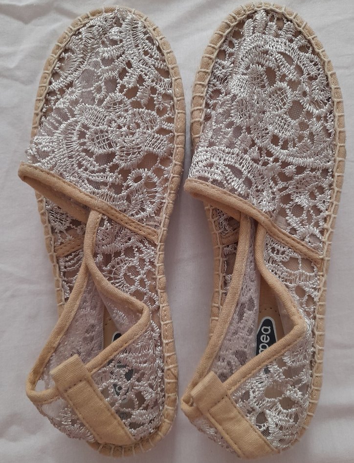 Nakışlı dantel örgü kumaş ve dolgu topuklu bej espadril, bohem tarzını günlük kullanıma uygun şekilde sunar. İthal marka hiç kullanılmadı