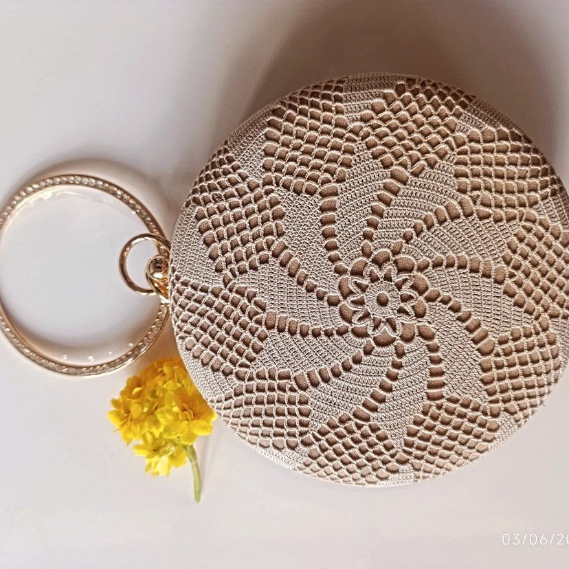 Bej renkte, nakışlı ve dantel detaylı bohem tarzda kadın portföy çanta. Yuvarlak şekilli ve altın renkli halka saplı, düğünler için uygun.