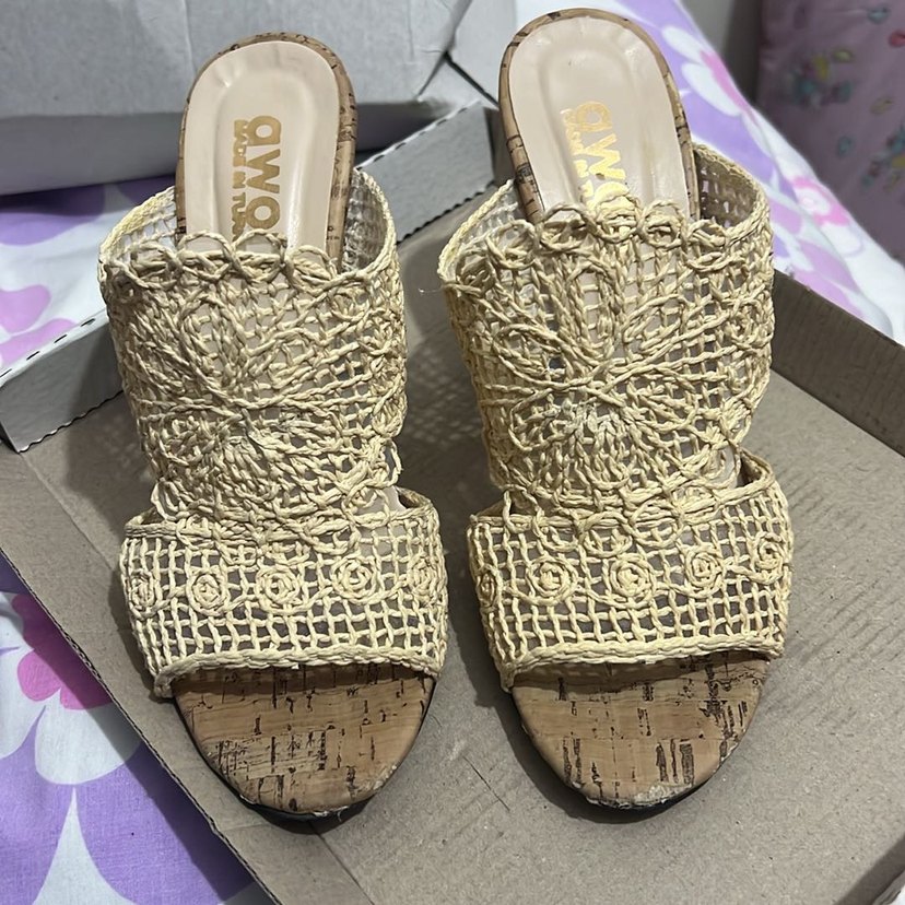 Nakışlı dantel detaylara sahip bej örgü terlikler, dolgu topuklu ve vintage bohem tarzında. Günlük kullanıma uygundur.