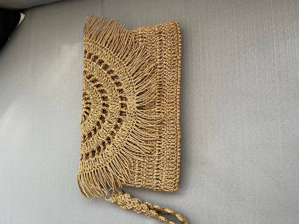 Bej renkli, parlak örgü dokulu, nakışlı detaylara ve dantel püsküllere sahip bohem tarzda kadın portföy çanta.