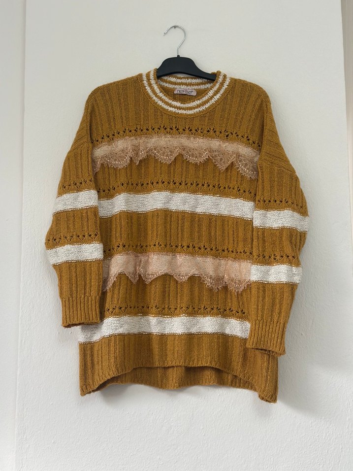 Bej renkte, nakışlı ve örgü detaylı, bol kesim uzun kollu kadın kazak. Rahat bohem tarzıyla günlük kullanıma uygundur.