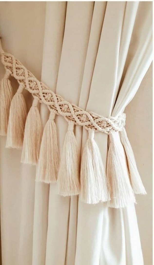 Hafif bej renkli, nakışlı detaylara sahip bohem tarzda perde tutucu