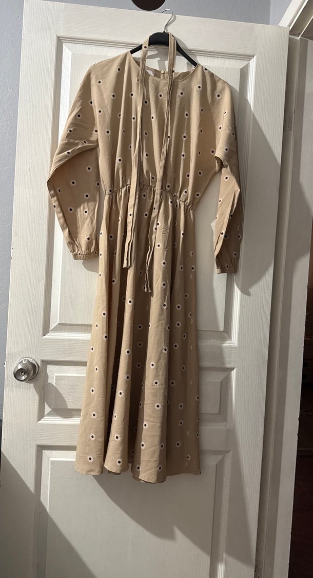 Bej renkte, nakış detaylı, bol kesim ve drapeli uzun elbise. Uzun kollu ve bisiklet yaka tasarıma sahip, günlük kullanıma uygun bohem stil elbise.